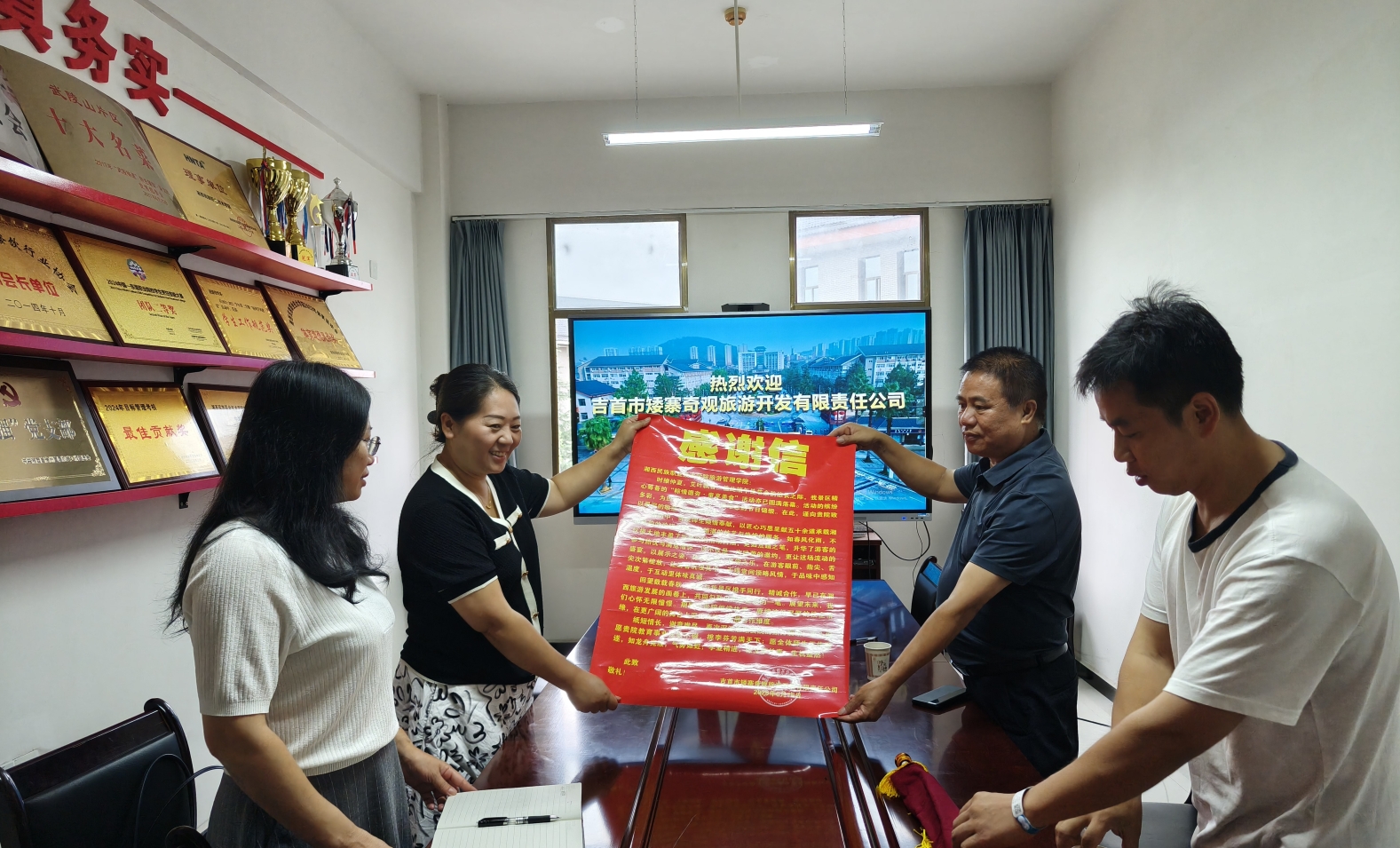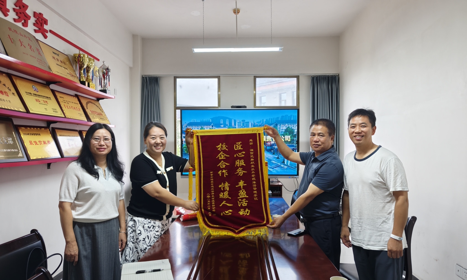 6月27日上午,吉首市矮寨奇观旅游区运营总监龙志刚与艺术团团长彭英生一行专程来到湘西民族职业技术学院旅游管理学院,送上饱含深情的感谢信与一面书写着“匠心服务丰盈活动,校企合作情暖人心”的锦旗,以此表达对旅游管理学院师生在景区“粽情德夯·童享美食”活动中贡献的由衷谢意。